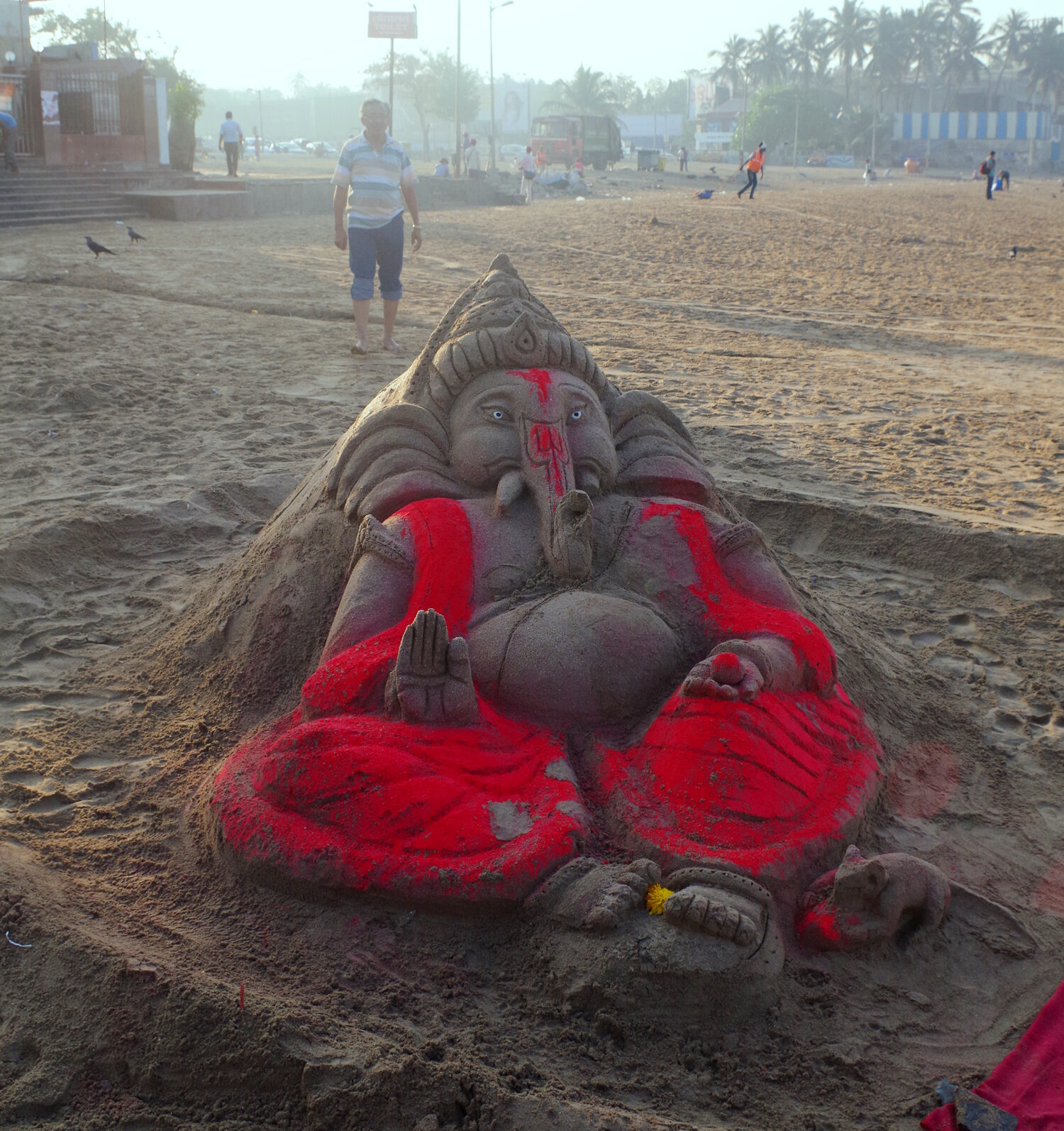 Juhu BeachBisher hatte ich immer nur von „Juhu Beach“ gehört, konnte mir aber bisher nichts darunter vorstellen. Also dieses mal sollte es soweit sein. Juhu Beach, einer der bekanntesten Strände Mumbais, liegt an der Westküste der Stadt und ist ein beliebter Erholungsort für Einheimische und Touristen. Der weitläufige Strand ist ideal für entspannte Spaziergänge, beeindruckende Sonnenuntergänge und vielfältige Freizeitaktivitäten. Abends erwacht Juhu Beach zum Leben mit zahlreichen Straßenverkäufern, die lokale Köstlichkeiten wie Pav Bhaji und Bhel Puri anbieten. Wir buchten also ein Hotel direkt nahe Juhu Beach, das Beach Garden Hotel. Eigentlich war uns dieses von der Kategorie einen Tick zu teuer, aber schön soll es ja auch sein, wenn wir mit unseren Kindern nach Indien reisen. Das Beach Garden wird wohl hauptsächlich für Hochzeiten gebucht. Jedenfalls verfügt es über einen großen Garten für die Hochzeitsfeierlichkeiten. Von unserem Zimmer und Veranda aus im ersten Stock konnten wir „von oben“ recht gut das Treiben auf den Hochzeiten verfolgen. Der Strand wird auch genutzt um Puja für die Toten ab zu halten. So fanden wir gerade morgens Tonfiguren von Gottheiten, meist Ganescha, am Strand. Diese kleinen Elefantengötter begleiten uns auch heute immer wieder, denn es vergeht kaum ein Indien-Urlaub, ohne dass wir die ein oder andere dieser Figuren mit nach hause nehmen. |